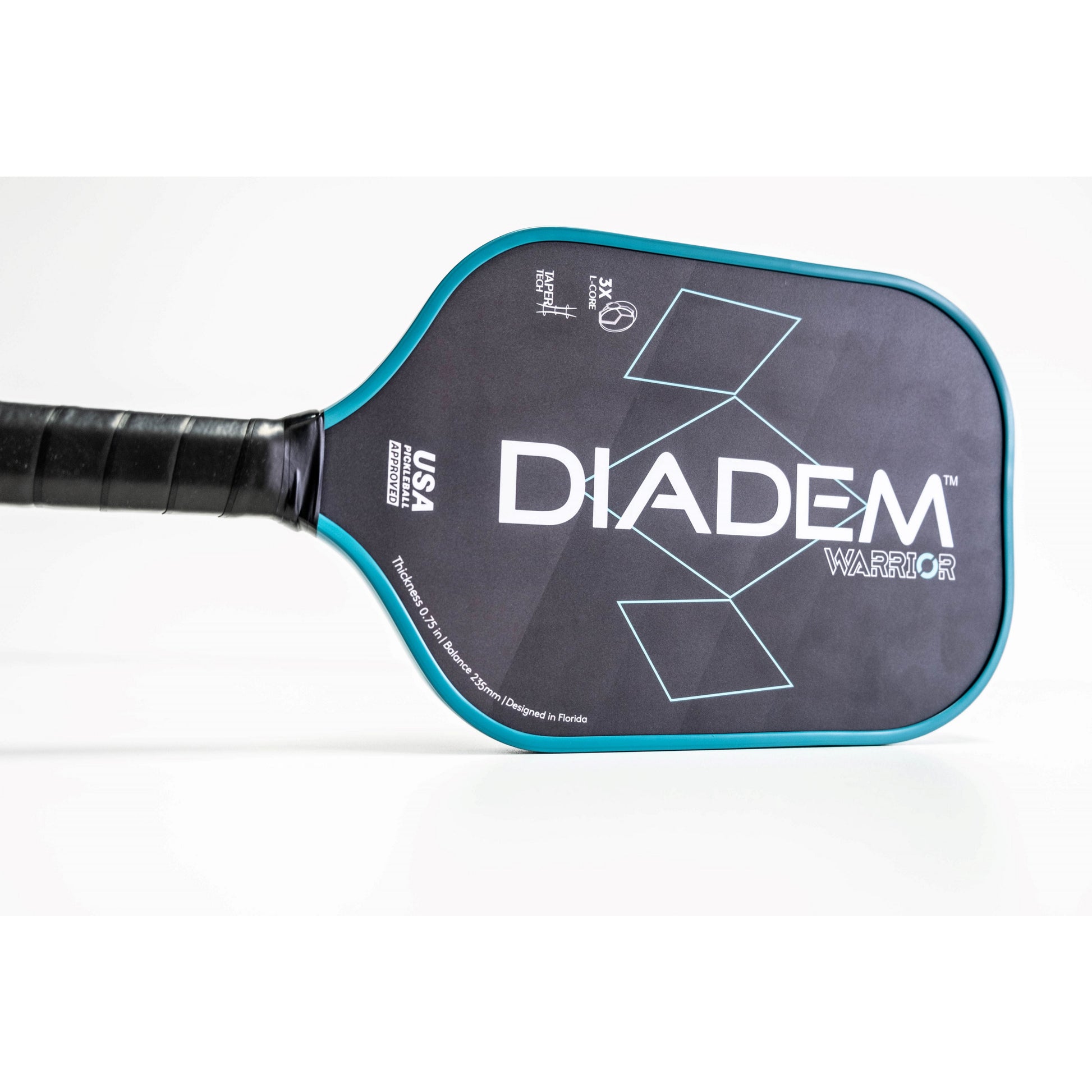 The DIADEM WARRIOR Paddle is a revolution of the pickleball paddle. Designed with multiple new technologies developed by Diadem that enhance the playability of the modern paddle. The 3X L-Core enables a player to feel the ball better on dinks while still creating power on hard hits. Three different honeycomb types are sandwiched to achieve a 19mm paddle thickness gives the player an incredible solid and stable feel.